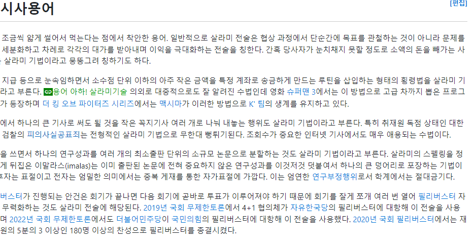 살라미 살라미식(Salami Tactics)은 정치적 또는 사회적 목표를 달성하기 위해 작은 단위로 나누어 점진적으로 접근하는 전략을 의미합니다. 이 용어는 한 번에 큰 변화를 시도하기보다는, 여러 작은 변화를 통해 목표를 달성하려는 방식으로, 주로 권력이나 자원을 점진적으로 확보하는 데 사용됩니다.