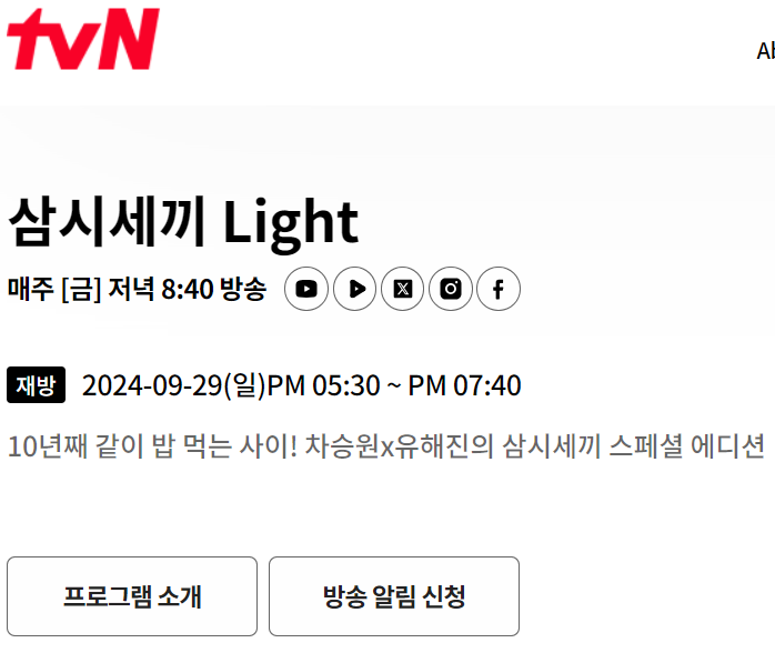 삼시세끼 라이트 임영웅 편은 매주 금요일 TvN에서 방영됩니다.