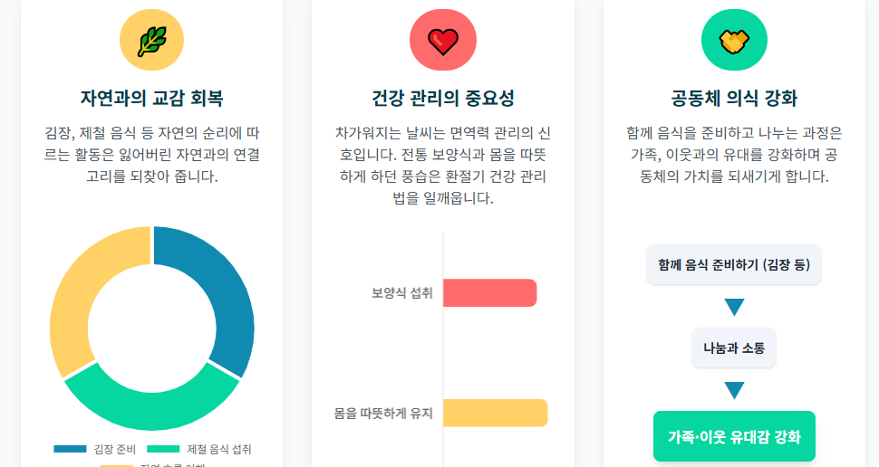 - 자연과의 교감 회복: 김장 준비나 제철 음식 섭취 등은 자연의 흐름을 이해하고 그에 맞춰 살아가는 법을 가르쳐 줍니다. 이는 바쁜 현대인에게 잃어버린 자연과의 교감을 회복하는 중요한 기회가 됩니다.