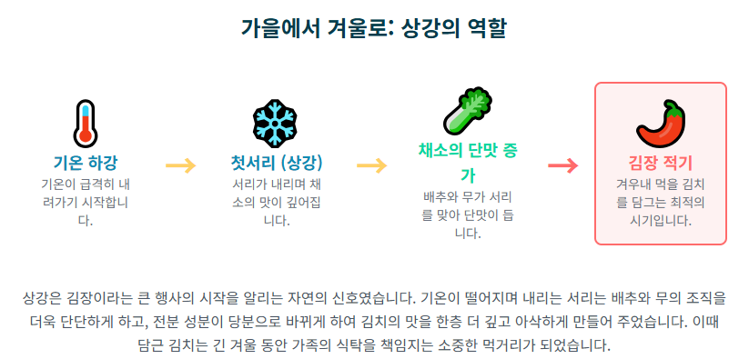 많은 가정이 김장 시기를 '상강' 전후로 잡았으며, 이웃과 품앗이를 하며 공동체 의식을 다지는 중요한 사회적 활동이었습니다.