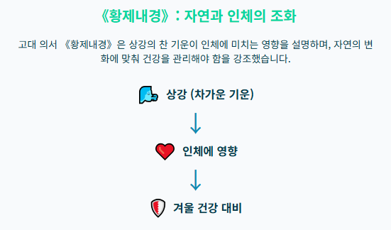 예를 들어, 중국의 고대 의서인 《황제내경》에서는 서리가 내리는 시기가 인체에 미치는 영향을 다루며 찬 기운에 대비할 것을 강조했습니다.