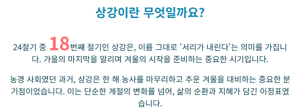 - 건강 관리의 중요성: 서리 내리는 찬 기운은 면역력 관리에 대한 경고이기도 합니다. '상강' 시기에 전통적으로 보양식을 먹거나 몸을 따뜻하게 했던 풍습은 환절기 건강 관리의 중요성을 일깨웁니다.