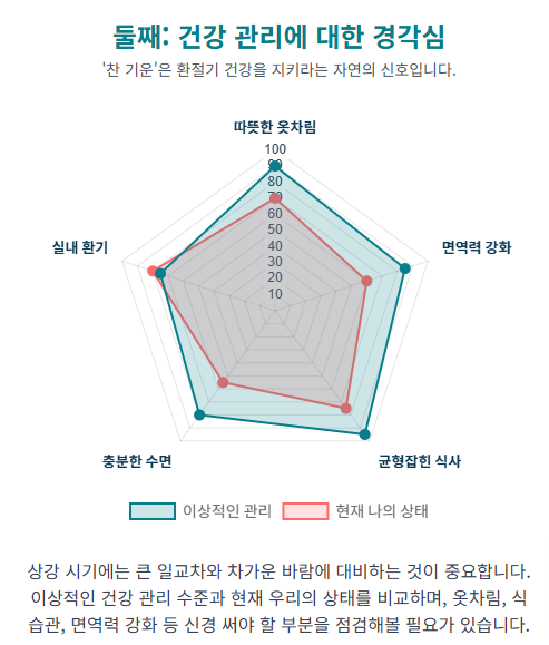 일교차가 심해지고 찬 바람이 부는 '상강'은 환절기 건강에 각별히 신경 써야 하는 시기임을 알려줍니다. **상강뜻**이 담고 있는 '찬 기운'이라는 의미는 옷차림을 단단히 하고, 따뜻한 음식을 챙겨 먹으며, 면역력 강화에 힘쓰라는 무언의 조언이 될 수 있습니다.