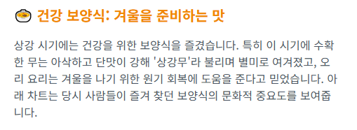 또한, 일부 지역에서는 상강 때 뽑은 무가 맛이 좋다고 하여 '상강무'를 별미로 즐기거나, 오리 보양식 등을 먹으며 다가올 겨울을 대비하는 건강관리의 의미도 담겨 있었습니다.