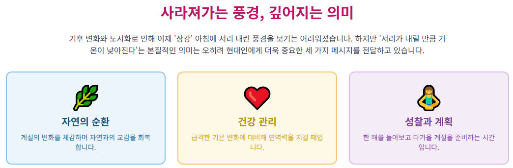 현대에 와서는 기후 변화와 도시화로 인해 예전처럼 들판에서 서리 내린 풍경을 마주하기 쉽지 않습니다. 그럼에도 불구하고 '서리가 내린다'는 **상강뜻**은 여전히 우리에게 중요한 메시지를 전달합니다.