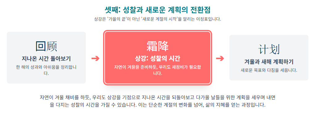이러한 일련의 과정이 천문학적인 '상강'의 위치와 딱 맞아떨어지며, **상강뜻**이 단순한 민간 신앙이 아니라 과학적 원리를 내포하고 있음을 알 수 있습니다.