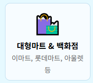 - **대형마트, 백화점:** 이마트, 롯데마트, 홈플러스, 백화점, 아울렛 등