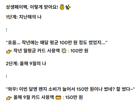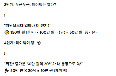이 경우, 9월의 페이백 산정액은 50만원(150만원 - 100만원)이 됩니다. 이 금액의 20%인 **10만원**이 9월의 페이백으로 지급됩니다.