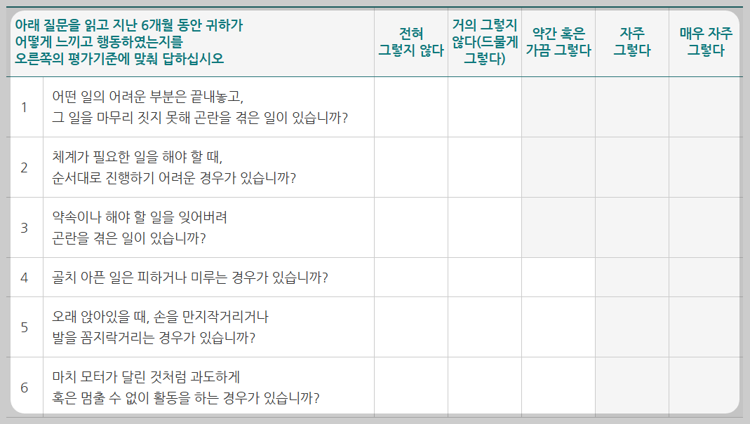 성인 ADHD를 의심할 경우, 자가진단 테스트를 통해 자신의 증상을 점검해 볼 수 있습니다.