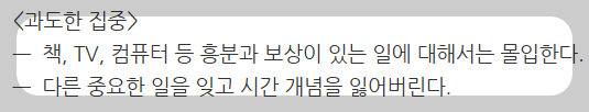 - 주의력 부족 : 일상적인 업무나 대화에서 집중하기 어려움.