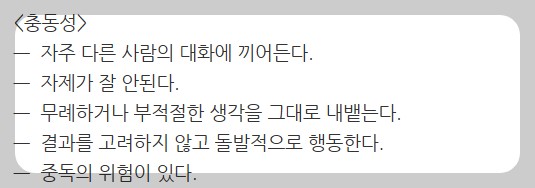 - 충동성 : 즉흥적으로 행동하거나 결정을 내리는 경향.