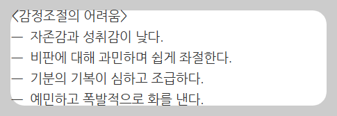 - 감정 기복 : 감정의 변화가 심하고, 스트레스에 민감함.