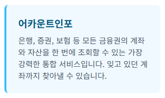 은행, 증권사, 보험사, 카드사 등 내 명의로 된 모든 금융 계좌와 금융자산을 한눈에 조회할 수 있는 서비스입니다. 휴면예금, 미수령 보험금은 물론, 숨겨진 계좌까지 모두 찾아낼 수 있어 가장 유용합니다.
