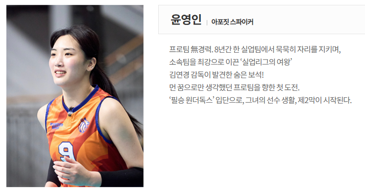 오랫동안 실업팀에서 정점을 지켜온 **윤영인 선수**에게 **원더독스**는 단순한 도전 이상의 의미였습니다. 그녀에게는 늘 **프로 무대**라는 닿을 수 없는 꿈이 있었고, **김연경 감독**은 바로 그 꿈을 현실로 만들어 줄 유일한 열쇠였습니다. 김 감독은 그녀의 **강력한 스파이크 능력**과 **에이스 기질**을 높이 평가하며 팀의 숨은 보석으로 직접 발탁했습니다.