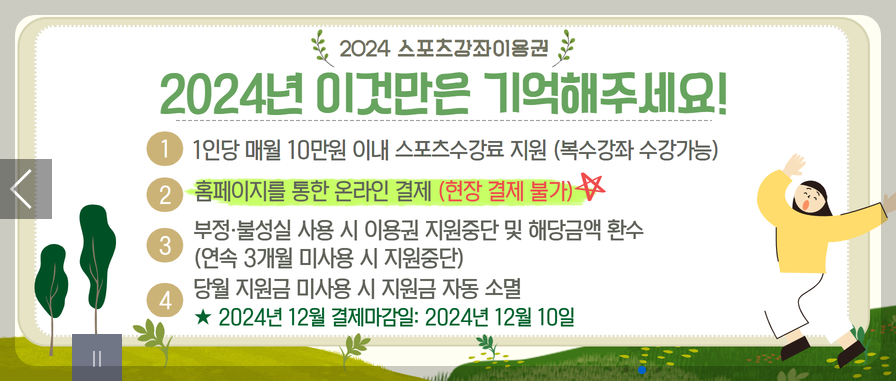 따라서, 지원금을 효율적으로 활용하여 정기적으로 스포츠 강좌에 참여하는 것이 중요합니다. 지원금은 매월 지급되며, 사용하지 않은 금액은 이월되지 않으니 주의해야 합니다.