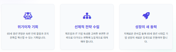 65세 정년 시대는 기업에게 도전이자 기회입니다. 성공적인 연착륙을 위해 다음의 종합적인 대응 전략이 필요합니다.