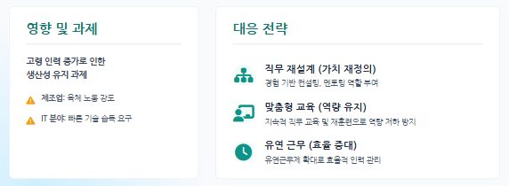 - 장기적 인력 운용 계획 수립: 고령 인력 비중 증가에 맞춰 채용, 배치, 교육 등 인력 계획을 재설계.