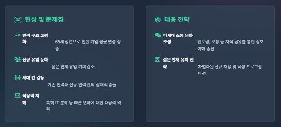 - 다세대 공존을 위한 조직 문화 혁신: 소통 강화, 멘토링 활성화, 세대 간 시너지 창출.