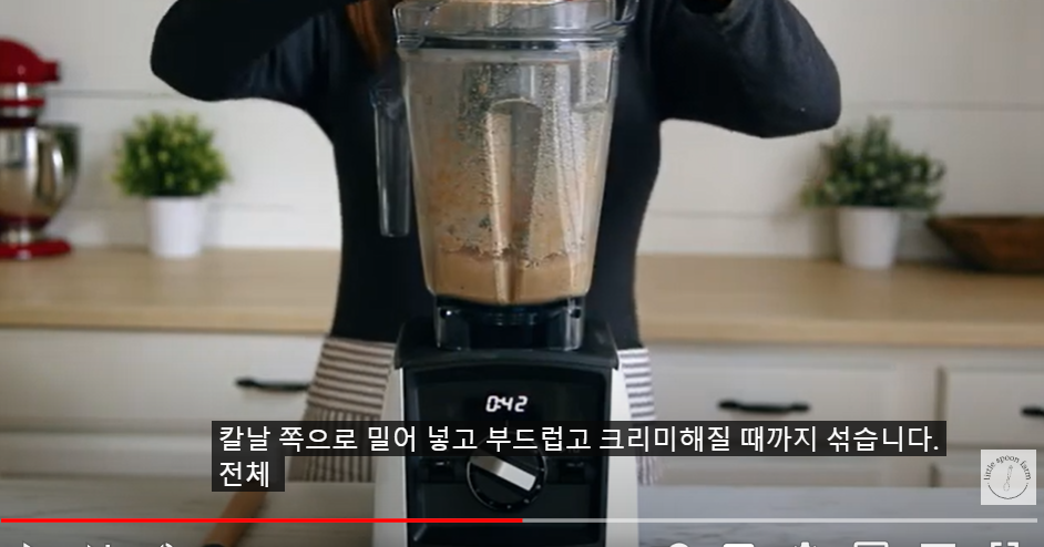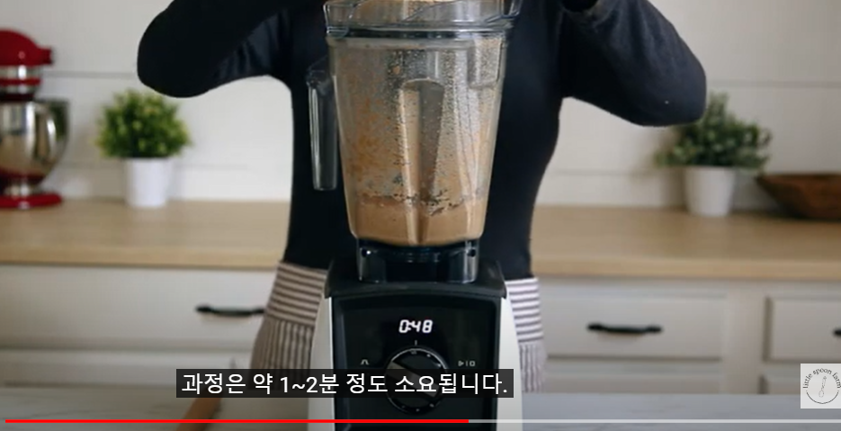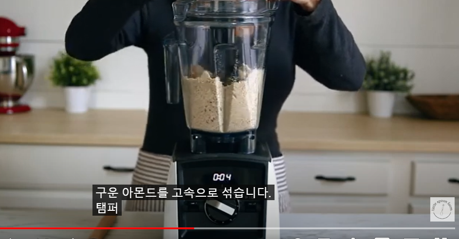 - 구운 아몬드를 블렌더에 넣고, 부드러운 크림 상태가 될 때까지 갈아줍니다. 중간에 멈추고 고정된 아몬드를 긁어내는 과정을 반복합니다.