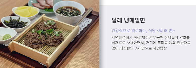 '양양 핀란드'라고 불리는 달래촌은 이름처럼 자연 속에 고즈넉하게 자리한 곳입니다. 음식점과 함께 몸마음치유센터, 힐링센터가 운영되고 있어, 식사뿐만 아니라 진정한 휴식을 원하는 분들께 안성맞춤인 장소입니다. 조용하고 깔끔한 분위기에서 식사를 기다리는 동안에도 편안함을 느낄 수 있었습니다.