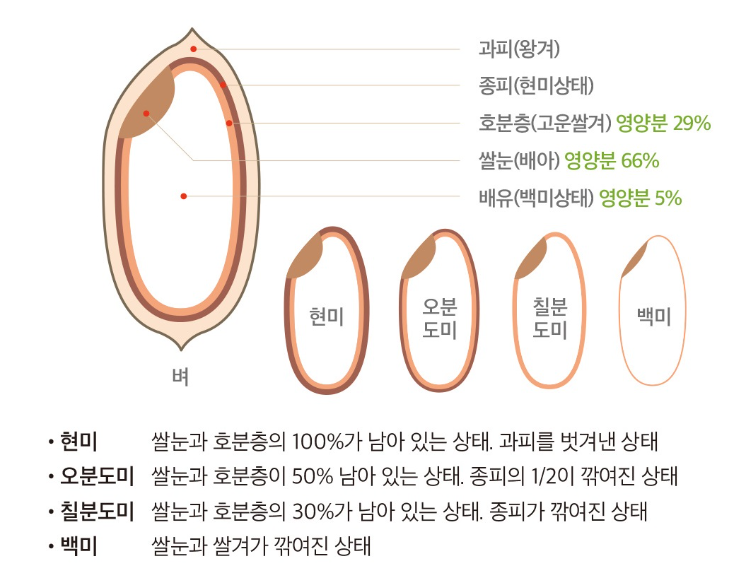 쌀은 도정 과정을 통해 껍질과 배아를 제거합니다. 오분도미는 이 도정 과정에서 쌀의 껍질을 약 95% 제거하고, 배아를 최소한으로 남겨두어 영양소를 최대한 보존한 형태의 쌀을 의미합니다. 이처럼 도정 정도에 따라 오분도미는 다양한 건강 효능을 지니고 있습니다.
