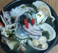 드디어 기다리던 해신탕이 상에 올랐을 때, 그 비주얼에 온 가족이 깜짝 놀랐습니다. 커다란 냄비 가득 키조개, 백합, 가리비, 닭, 문어, 뿔소라, 그리고 싱싱한 전복까지! 정말이지 없는 게 없는 해산물 파티가 눈앞에 펼쳐졌죠. 보기만 해도 건강해지는 기분이었어요.