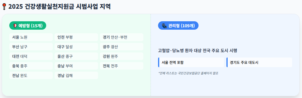 관리형은 예방형보다 훨씬 넓은 지역에서 시행됩니다. 고혈압·당뇨병 환자라면 전국 대부분의 주요 도시에서 참여할 수 있습니다. (전체 리스트는 국민건강보험공단 홈페이지에서 확인 가능하며, 주요 지역은 서울 전역, 경기도 대도시 등을 포함합니다.)