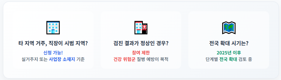 A3. 현재 시범 운영을 통해 효과를 검증 중이며, 2025년 이후 단계적으로 전국 확대를 검토하고 있습니다. 지역이 포함되지 않았다면 조금만 기다려 주세요!