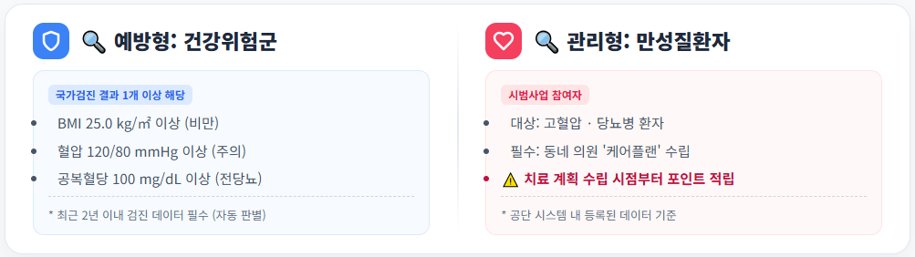 일차의료 만성질환관리 시범사업에 참여하고 있는 고혈압·당뇨병 환자여야 합니다. 단순히 약만 타는 것이 아니라, 동네 의원에서 '케어플랜(치료 계획)'을 수립받은 상태여야 포인트 적립이 시작됩니다.