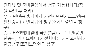 - 절차: 국민연금공단 '전자민원 서비스' 접속 → 공동인증서 로그인 → 노령연금 청구 메뉴 선택 및 정보 입력 → 제출