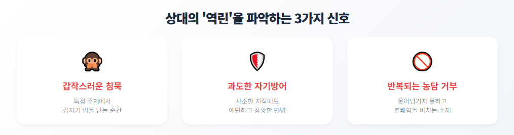 - 🚩 갑작스러운 침묵: 즐겁게 대화하다가 특정 주제에서 갑자기 입을 닫는다면 그 근처에 역린이 있을 확률이 높습니다.