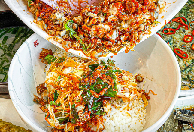 먼저 재첩 회무침은 아삭한 채소와 매콤달콤한 양념이 어우러져 입맛을 돋우기에 최고였습니다. 통통한 재첩 살이 씹을수록 고소함을 더해주었고, 밥 위에 올려 비벼 먹으니 그야말로 밥도둑이 따로 없었습니다. 상큼하면서도 감칠맛 나는 양념이 재첩의 신선함을 한층 더 살려주더군요.