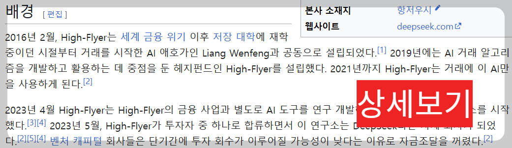2016년 설립 이후, 빠르게 성장해 왔습니다. 2019년에는 AI 기반의 양적 거래 시스템을 도입하여 금융 시장에서의 경쟁력을 높였고, 2022년에는 오픈소스 AI 모델을 개발하여 시장 점유율을 확대했습니다. 딥시크는 량원펑이 23년 7월 17일 설립한 신생기업(스타트업)으로, 저장성 항저우시에 본사를 두고 있습니다. 특히, 최근 두 달 만에 개발된 '딥시크-R1' 모델은 오픈 AI의 최첨단 모델과 경쟁할 수 있는 성능을 자랑하고 있습니다. 이러한 빠른 발전은 딥시크가 AI 분야에서의 선두주자로 자리매김하는 데 큰 역할을 하고 있습니다.