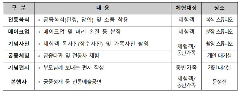 체험자는 부모님 중 한 분이 선택되어 조선시대 고위 문·무관의 복식을 입고, 가족들은 관람객으로 참여하여 함께 잔치를 즐길 수 있습니다.