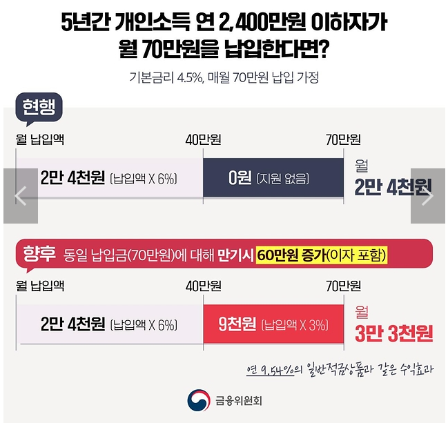 - 변경: 매월 최대 70만 원까지 납입할 수 있으며, 이는 연 9.54%의 일반적금상품과 같은 수익효과를 제공합니다.