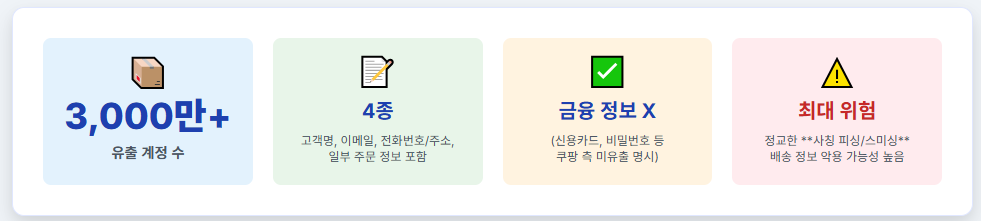 🚨 경각심 고취: 유출된 정보만으로도 정교한 **사칭 피싱/스미싱** 공격이 가능하며, 특히 배송 정보가 악용될 위험이 높습니다.