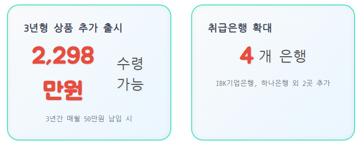 - 3년형 도입 배경: 기존 5년형의 긴 가입 기간이 부담스럽다는 의견을 반영하여, 더 짧은 기간에도 혜택을 누릴 수 있도록 선택의 폭을 확대했습니다.