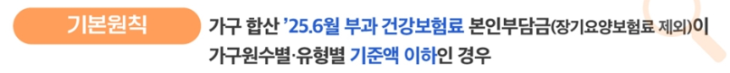 - 1인 가구: 청년층이나 고령층 1인 가구가 불리함을 겪지 않도록, 기준 건강보험료가 가구원 2인 가구의 약 90% 수준으로 완화되어 적용됩니다. (직장가입자 기준 연소득 약 7,500만원까지 혜택 가능)