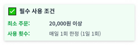 - 매일 1회만 발급 및 사용 가능하며, 최소 주문 금액 2만원을 충족해야 합니다.