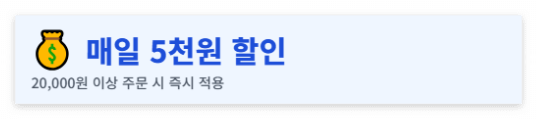 - 💰 매일 5천원 즉시 할인: 2만원 이상 주문 시 매일 5천원 할인을 즉시 받을 수 있습니다. 복잡한 과정 없이 할인 적용이 가능해 편리합니다.