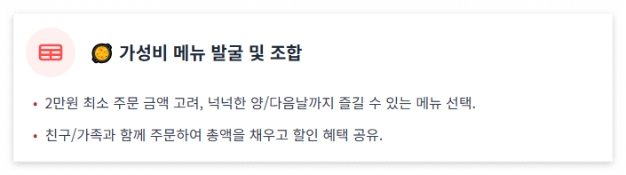 - 🥘 가성비 메뉴 발굴 및 조합: