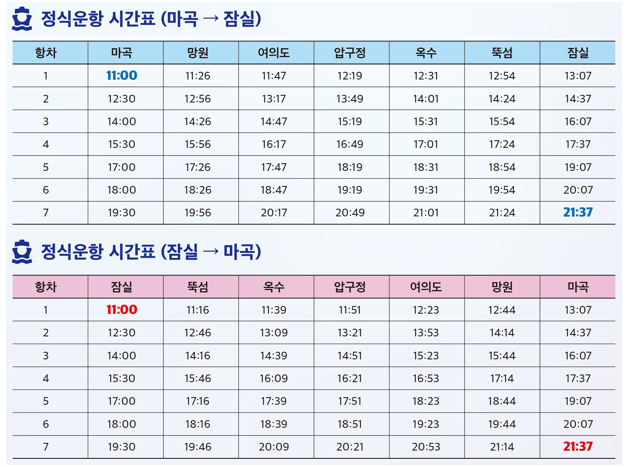 - **정류장 (예시)**: 마곡, 여의도, 반포, 옥수, 잠실 등
