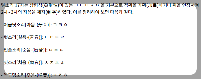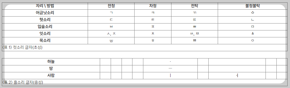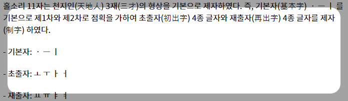 이렇게 하여 자음 17자와 모음 11자가 조합되어 총 28자의 체계를 이루게 됩니다.