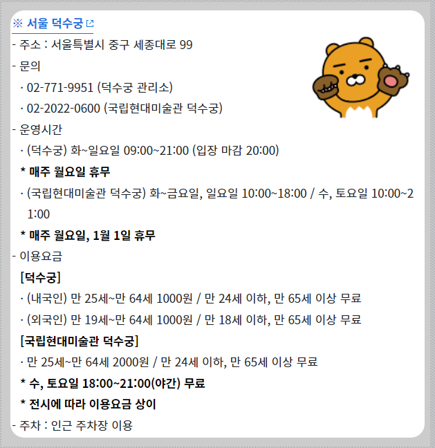 국립현대미술관 덕수궁에서는 특별 전시가 진행 중이며, 수요일과 토요일에는 야간 개장으로 무료 관람이 가능합니다.