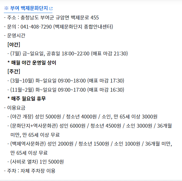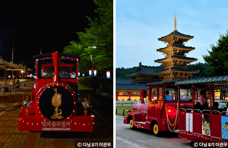 야간 개장 기간에는 ‘사비로 열차’를 타고 백제의 역사적 장소를 돌아보며, 달빛 아래에서 왕궁의 아름다움을 감상할 수 있습니다.