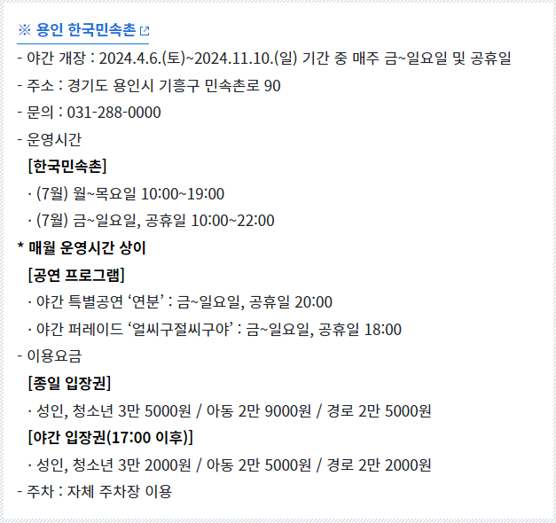 용인 한국민속촌은 조선시대의 마을을 재현한 곳으로, 금, 토, 일요일과 공휴일에 야간 개장이 이루어집니다.