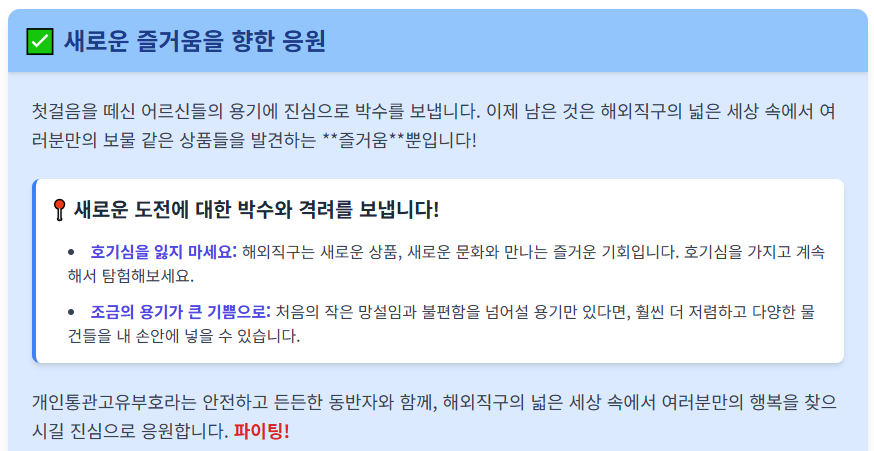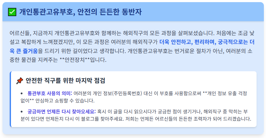 어르신들, 지금까지 개인통관고유부호와 함께하는 해외직구의 모든 과정을 살펴보셨습니다. 처음에는 조금 낯설고 복잡하게 느껴졌겠지만, 이 모든 과정은 여러분의 해외직구가 **더욱 안전하고, 편리하며, 궁극적으로는 더욱 큰 즐거움**을 드리기 위한 길이었다고 생각합니다.