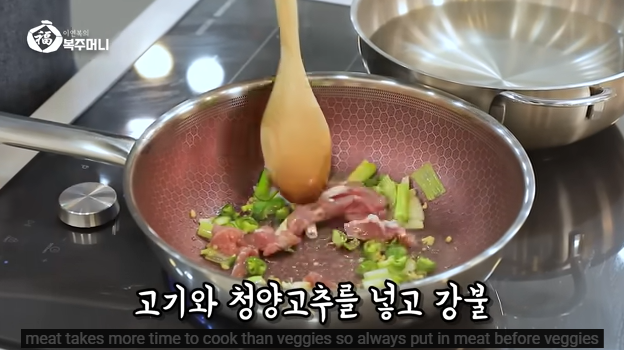 - ② 채소 볶기: 양파, 배추, 당근 등 채소를 웍에 넣고 센 불에 빠르게 볶아 기름으로 코팅합니다. 이는 **채소의 수분을 날리고 단맛을 응축**하는 핵심 작업입니다.