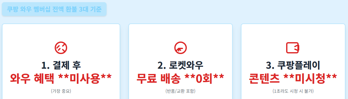 - **환불액:** **이용한 혜택의 가치**를 제외한 나머지 금액이 환불됩니다. (예: 쿠팡플레이 시청 기록이 있거나, 첫 달에만 제공되는 와우 혜택을 일부 이용한 경우)