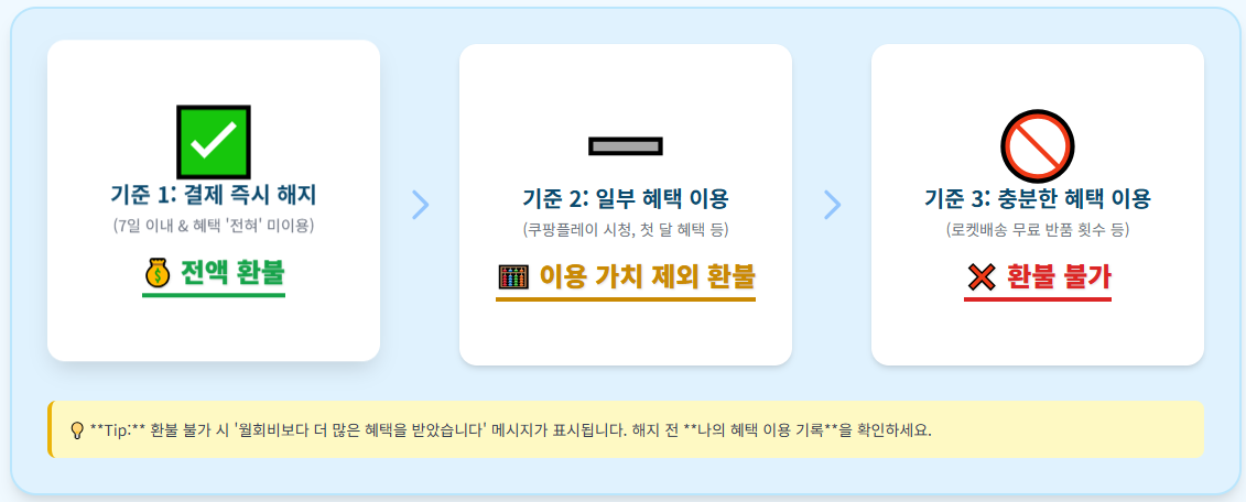 💡 Tip: 환불을 받을 수 없는 경우, 쿠팡은 '고객님은 월회비보다 더 많은 혜택을 받았습니다'라는 메시지를 띄웁니다. 따라서 해지 전 **나의 혜택 이용 기록**을 미리 확인하는 것이 중요합니다.